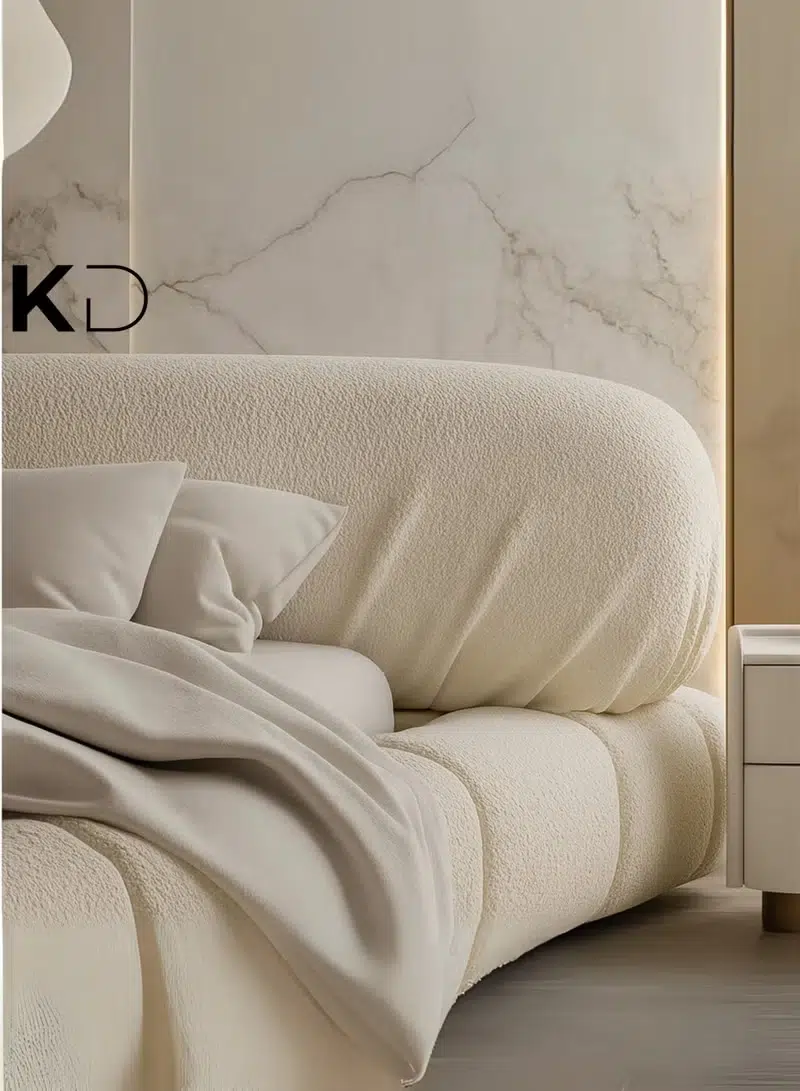 buy boucle upholstered bed Dubai UAE luxury beige bed modern bedroom furniture UAE best bed for small rooms and premium interiors.