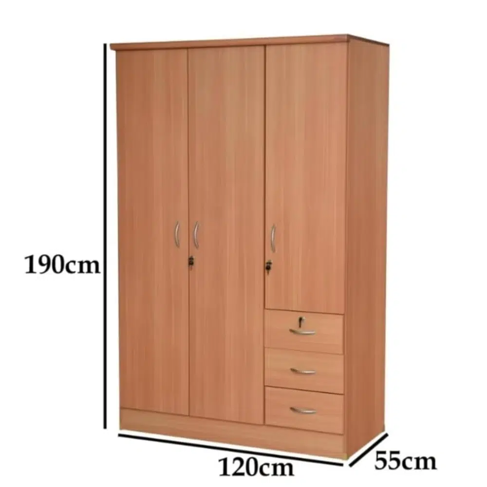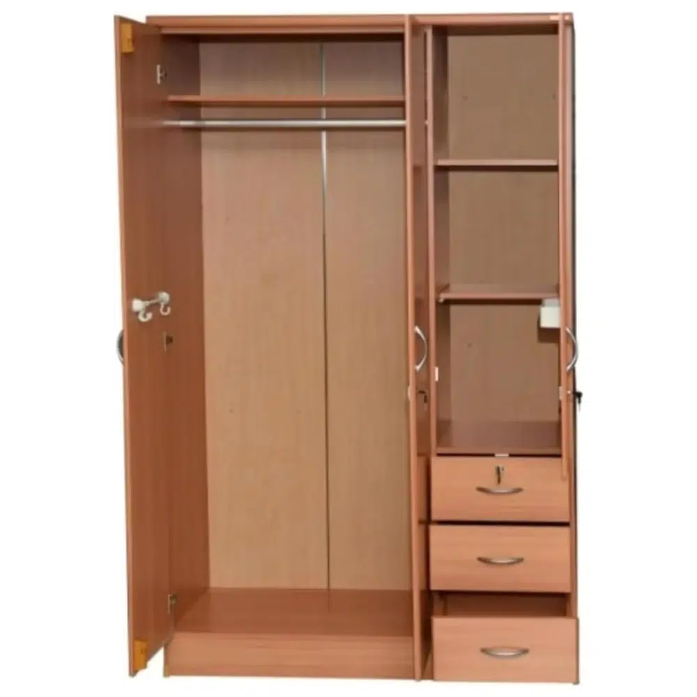 Overall, the Cremvanta wooden storage cabinet is designed for office furniture and home interiors that require enclosed and organized storage. The cabinet features a tall three-door structure combined with a side drawer section. This layout supports structured storage for documents, clothing, and everyday items. The vertical format helps maintain a compact footprint in different room settings.