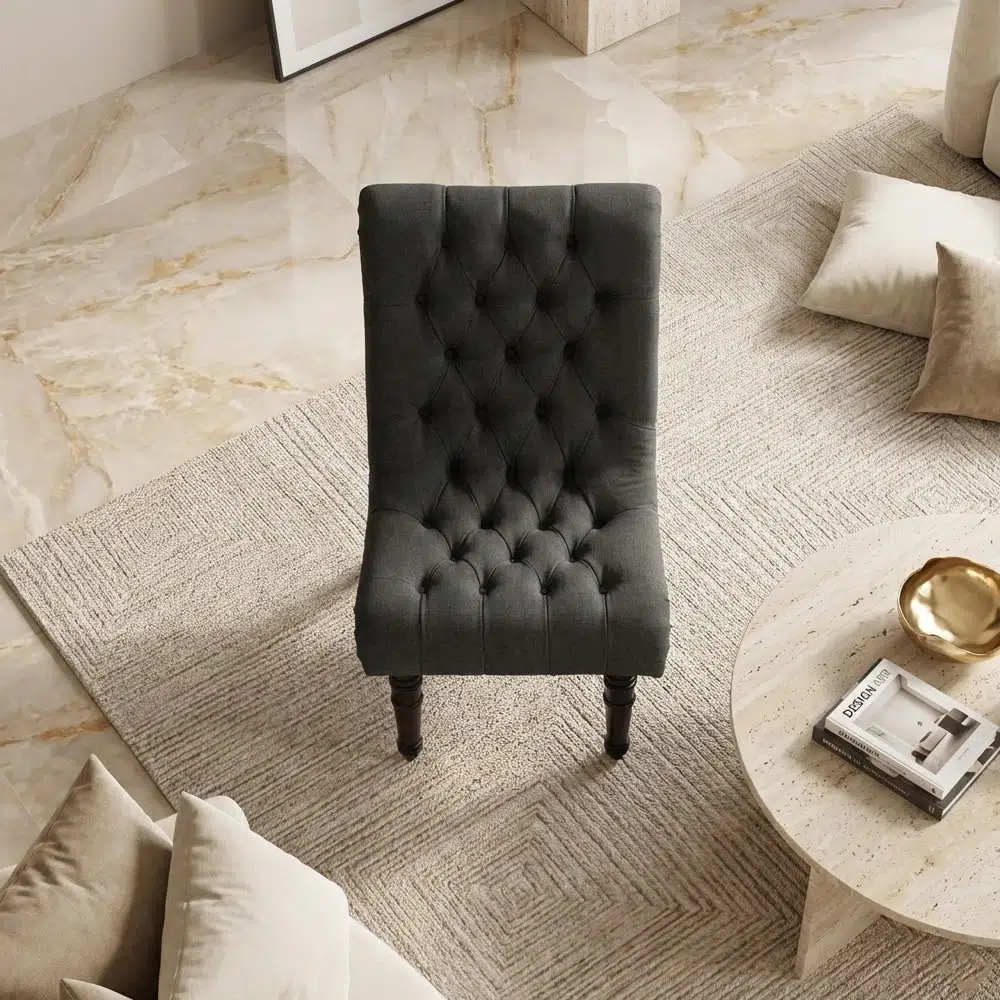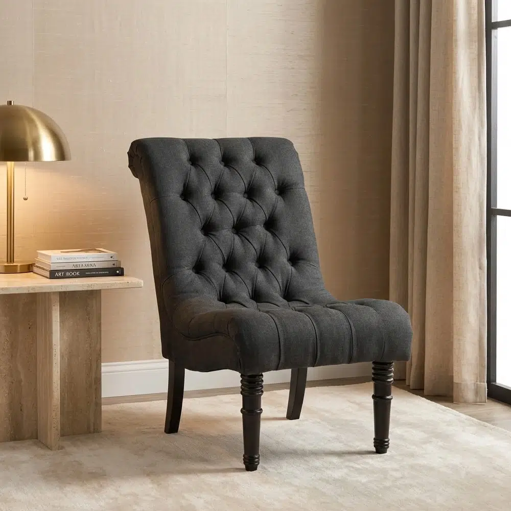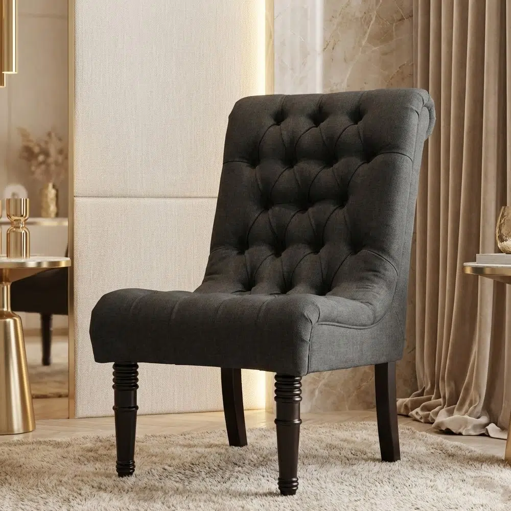 Upgrade your interior with this traditional button tufted accent chair, featuring a high back, linen fabric upholstery, and elegant black wooden legs perfect for UAE homes.
