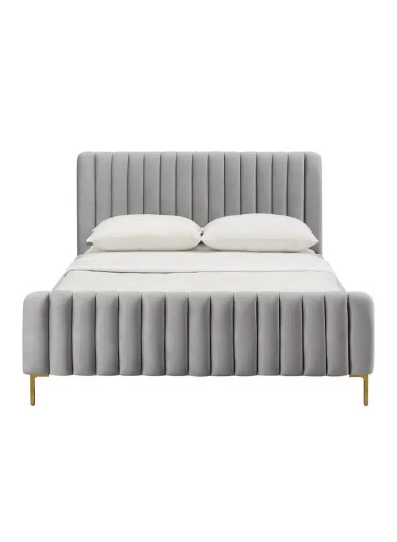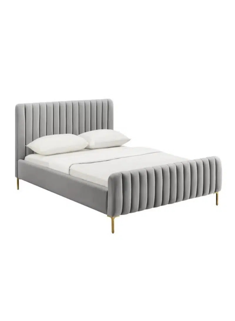 Additionally, the robust internal structure is engineered from high-quality MDF and engineered wood to ensure long-term stability. Meanwhile, the bed is supported by elegant gold-finished metal legs that contrast beautifully with the cool grey tones of the upholstery.