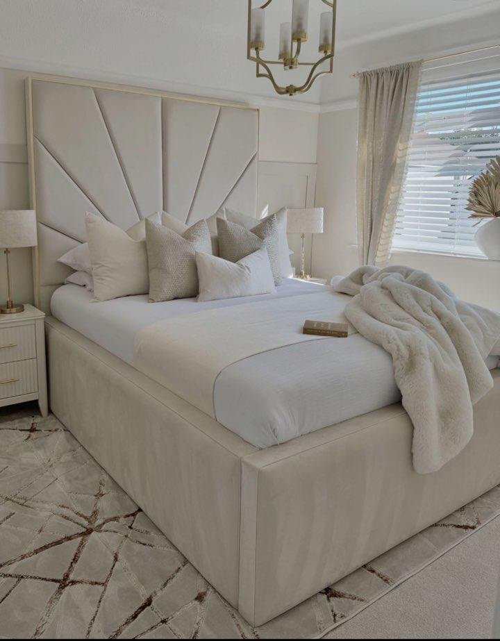 Transform your bedroom with the Savoy Bed with Gold Trim, where luxury meets functionality. Designed with a regal structure and premium cotton bedding, this bed enhances both style and comfort. Its low platform design offers a sleek and modern look while ensuring a cozy retreat for restful nights.