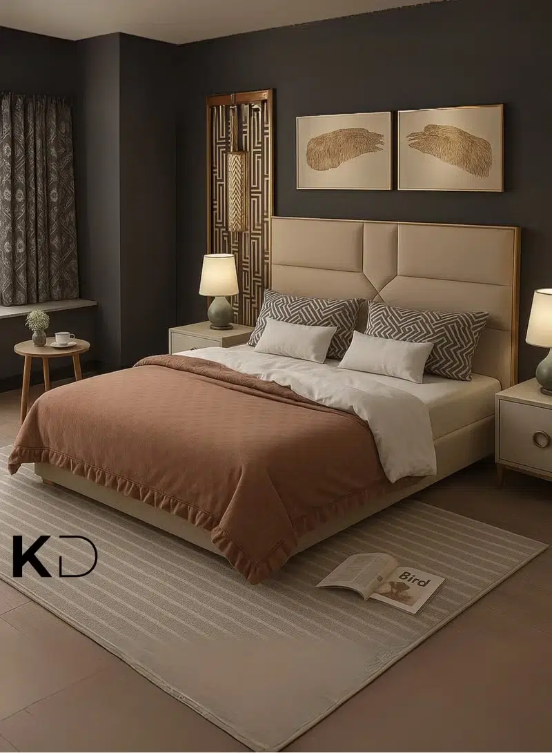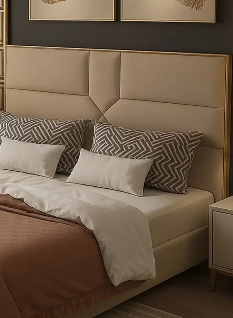 Moreover, the internal frame is meticulously engineered from a durable blend of MDF and engineered wood to ensure lasting stability. The standout headboard features unique diagonal stitching and paneling for a custom-made architectural look. Additionally, the neutral beige palette enhances the sense of space and light within the master suite. This design choice highlights the modern craftsmanship that homeowners in Dubai and Abu Dhabi prioritize.