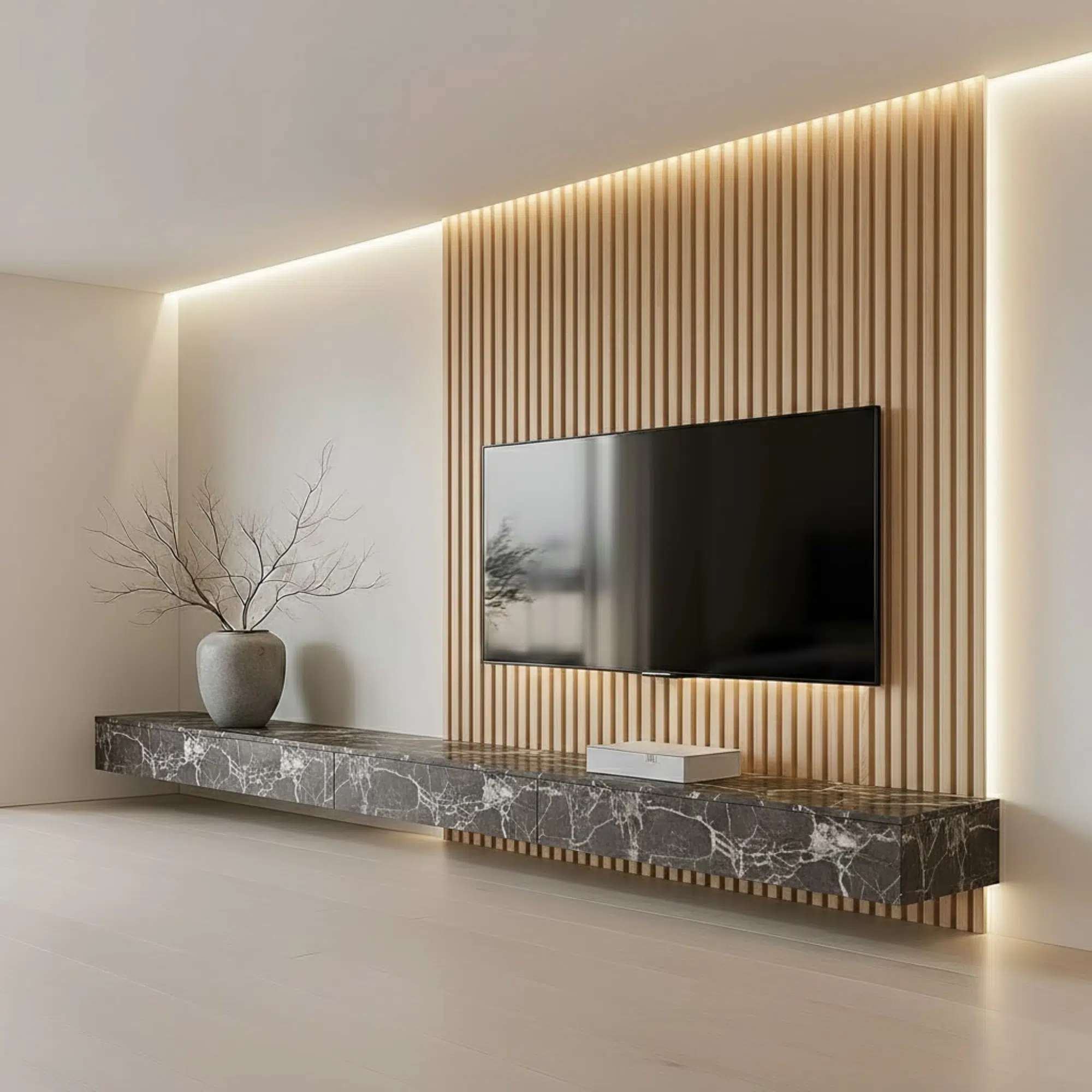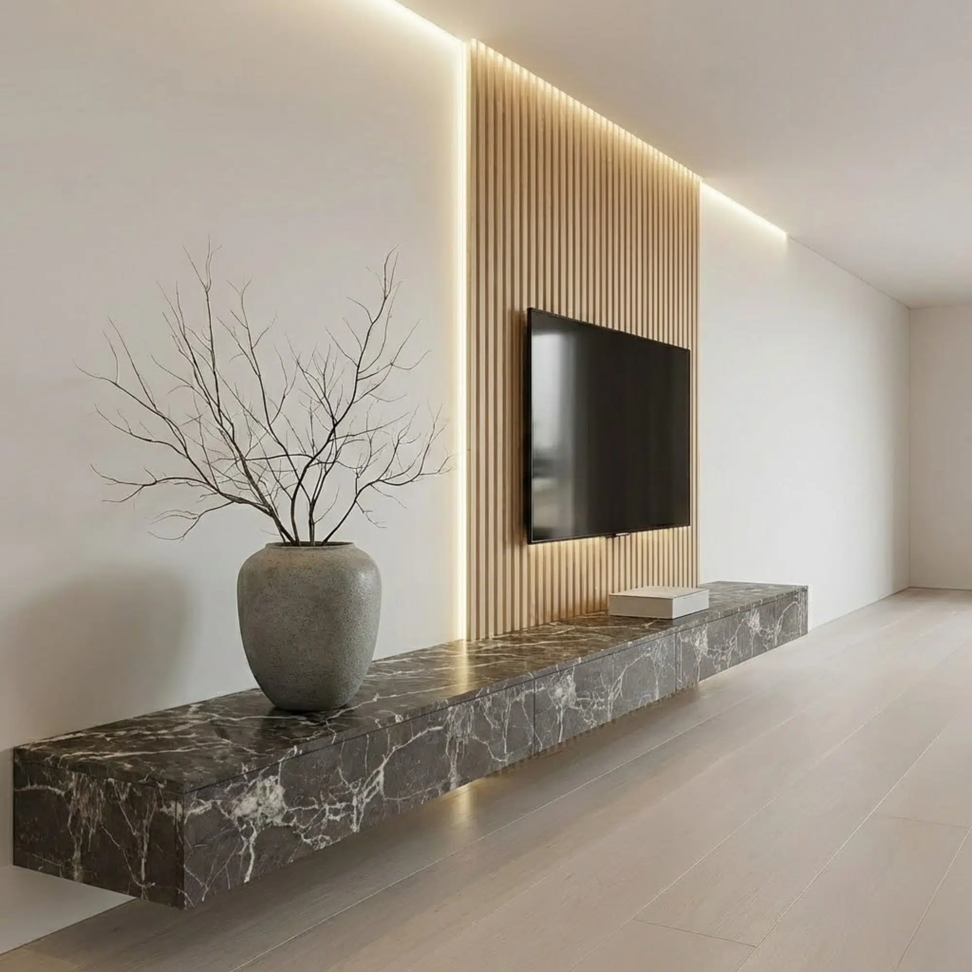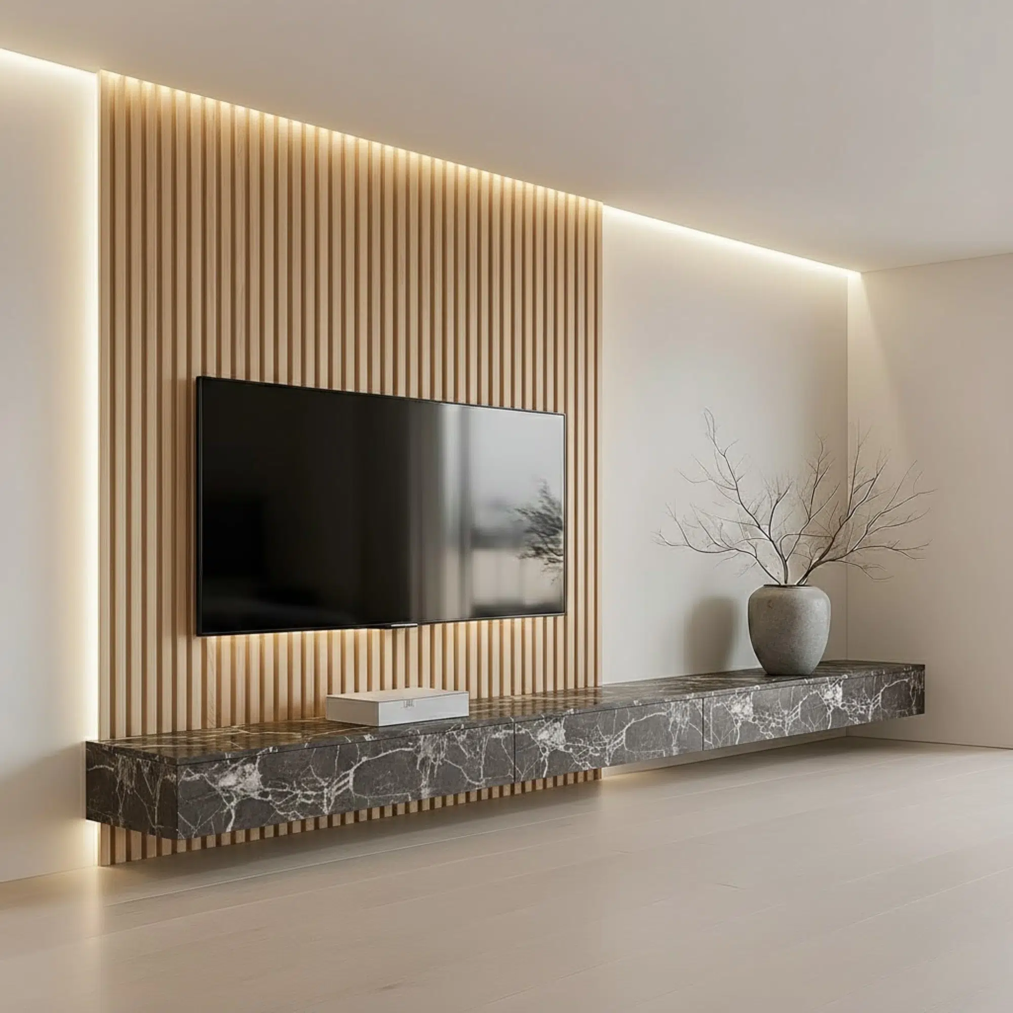 Modern Veltrano floating TV unit with slat panel and marble cabinet. Available as a custom-made in Dubai, Abu Dhabi, Sharjah, and across the UAE.