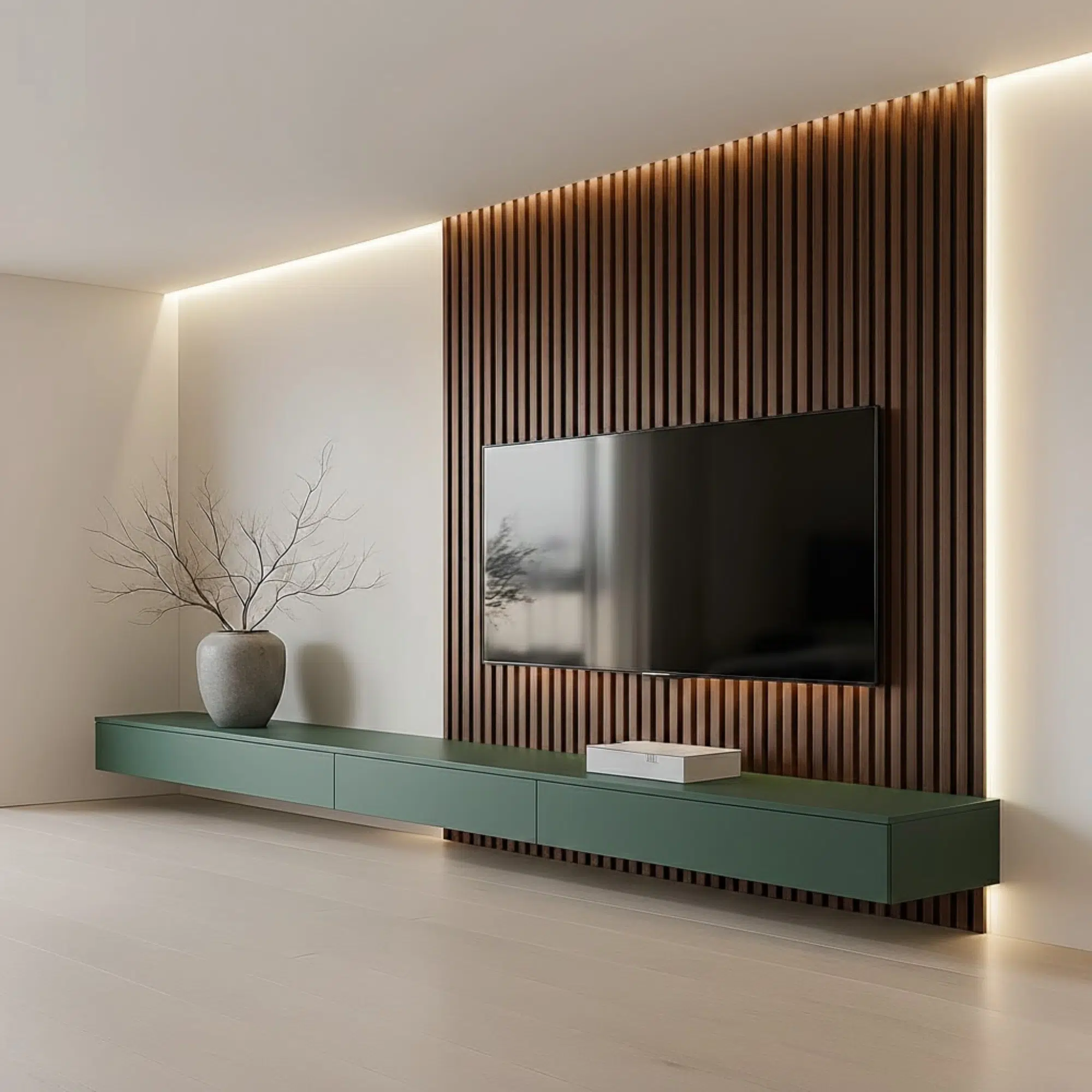 Modern Veltrano floating TV unit with slat panel and green cabinet. Available as a custom-made in Dubai, Abu Dhabi, Sharjah, and across the UAE.